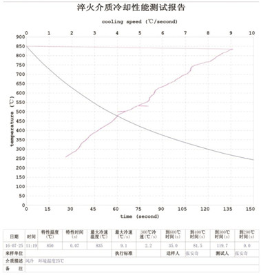淬厚大件高鉻鑄鐵適宜的ZFQ-A型淬火劑的濃度:原液與水配比1:6,其 大冷卻速度150C/s——200C/s之間, 大冷卻速度所在的溫度在7800C——8300C之間,在3000C的冷卻速度小于6.50C/s,在3000C到2000C馬氏體轉變溫度區域內所用時間大于20秒(S),(采用冷卻介質測定儀測定,測定溶液溫度300C,)。